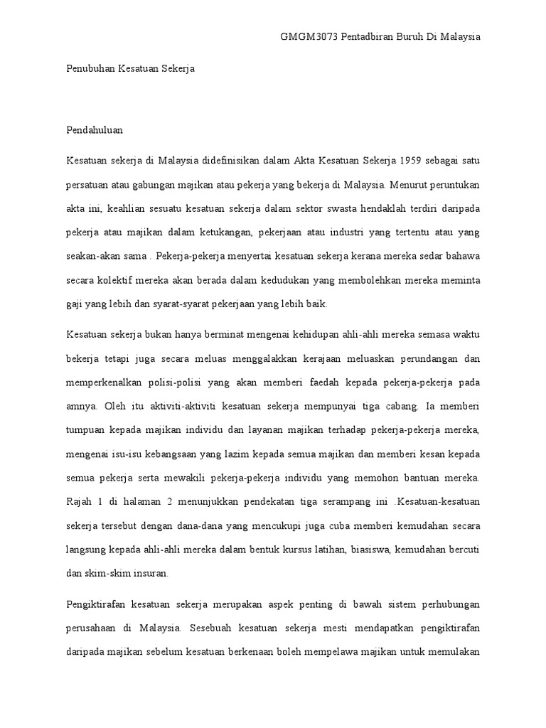 Senarai kesatuan sekerja di malaysia. Pdf on mar 21 2017 sumarnie binti saguna sumarnie and others published kesatuan sekerja di malaysia find read and cite all the research you need on researchgate. Sejarah perkembangan kesatuan sekerja di malaysia petikan daripada laporan tahunan pejabat pendaftaran kesatuan sekerja 1967 oleh k g george k m n pendaftar kesatuan sekerja malaysia pergerakan kesatuan sekerja di malaysia ialah pada asasnya merupakan suatu perkembangan selepas perang. Enakmen kesatuan sekerja mula diperkenalkan pada tahun 1940 tetapi tiada kesatuan sekerja ditubuhkan sehingga dan selepas perang di mana para pekerja disusun di bawah kesatuan sekerja.